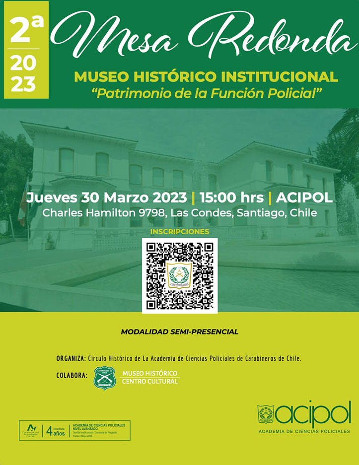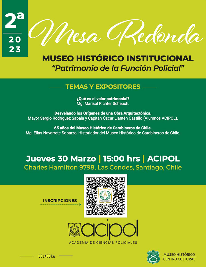Con motivo de este nuevo aniversario y debido a la vinculación histórica del entonces “Museo y Archivo Histórico” dependiente del Instituto Superior, anterior denominación de nuestro plantel de educación superior. La Academia de Ciencias Policiales invita a la comunidad a participar de la Mesa Redonda “Museo Histórico de Carabineros: Patrimonio de la Función Policial”, actividad académica semipresencial que será realizada el jueves 30 de marzo, desde las 15:00 horas en el Aula Magna en calle Charles Hamilton N° 9798, comuna de Las Condes.