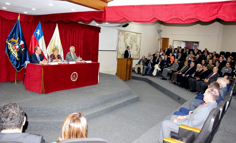 La ex Presidenta se dirigió a los presentes para hablarles del rol académico de la ANEPE en la construcción de una cultura de defensa y de la seguridad internacional, haciendo una muestra del escenario actual en temas de las relaciones internacionales y posibles amenazas para nuestra región. La ex mandataria habló del cambio climático, la migración, el avance tecnológico y otros temas que generan también desafíos para la Defensa Nacional.