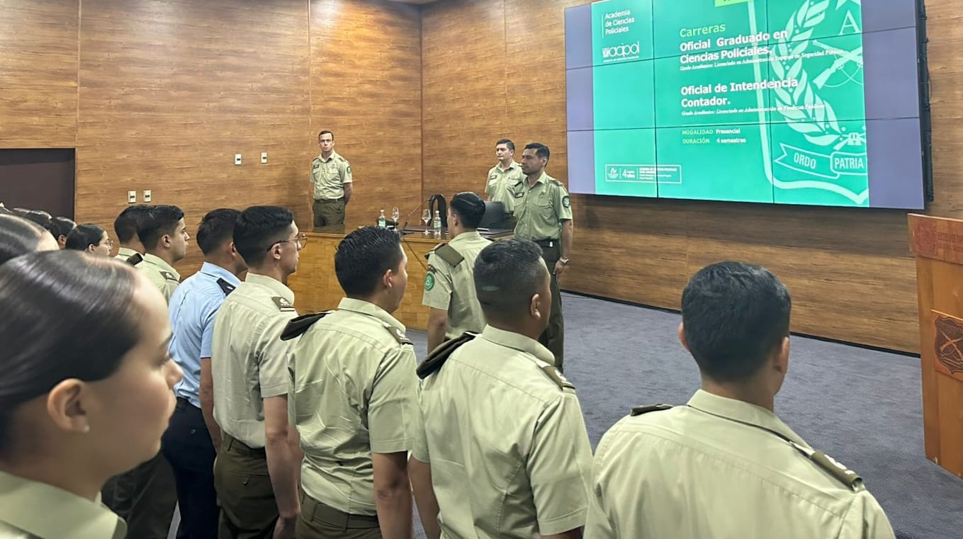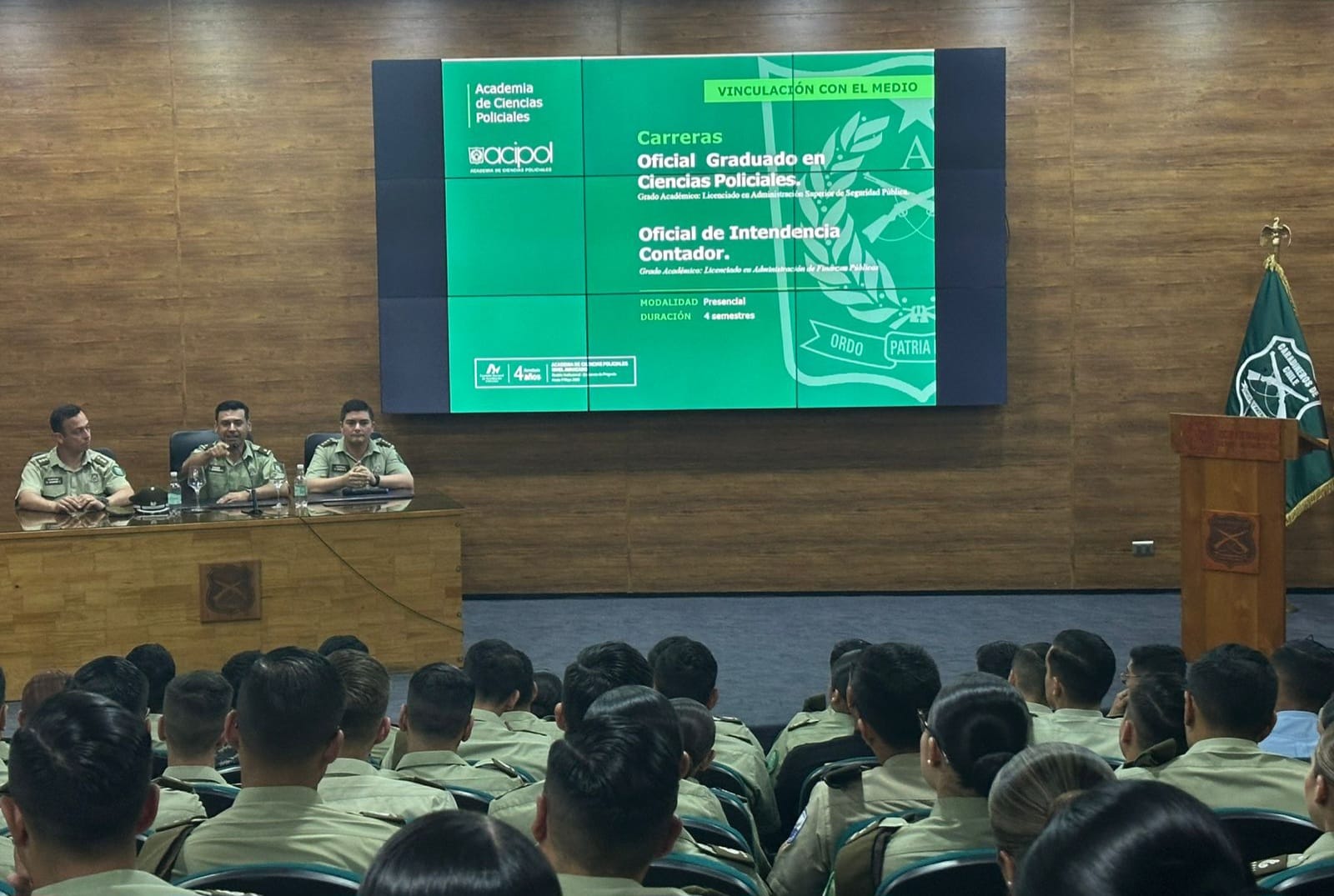 En el marco de nuestra pol铆tica de vinculaci贸n con el medio, la Academia de Ciencias Policiales de Carabineros de Chile (@Acipol_Carab) llev贸 a cabo un conversatorio dirigido a los aspirantes a oficial de 4to a帽o de la @EscuelaCarab. Durante la actividad, los oficiales alumnos de nuestra academia compartieron informaci贸n relevante sobre el proceso del Curso de Oficial Graduado en Ciencias Policiales y la oferta acad茅mica de nuestras ingenier铆as, destacando las oportunidades de desarrollo profesional que ofrece nuestro plantel.