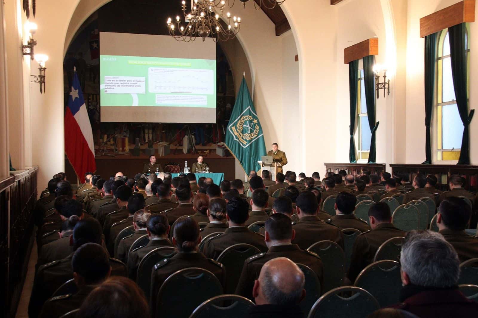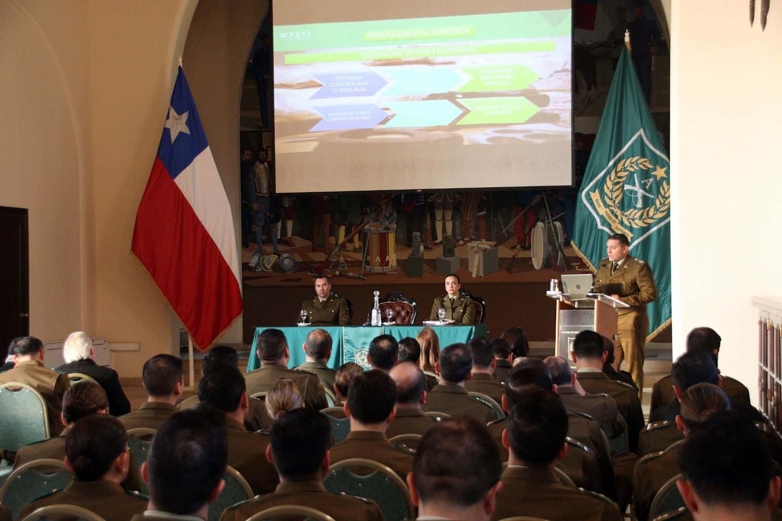 La jornada contó con la valiosa ponencia del Mayor Alejandro Bruggink Llanos, quien abordó la Ley 20.000, el impacto del crimen organizado en Sudamérica y la realidad del narcotráfico en Chile.