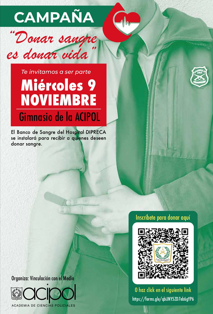 Te invitamos a ser parte de nuestra campaña “Donar sangre es donar vida”. Actividad organizada por la oficina de Vinculación con el Medio de la Academia de Ciencias Policiales.