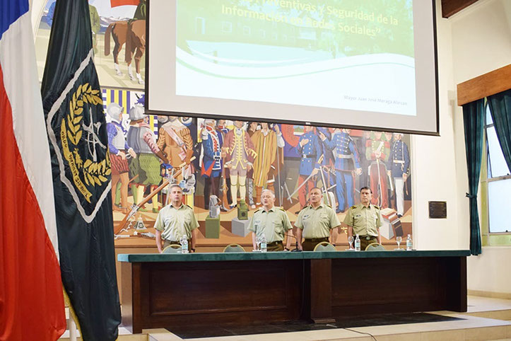 El inicio de actividades de este lunes 14 de noviembre comenzó de forma diferente. Con la visita del General Subdirector, General Inspector Marcelo Araya Zapata, junto al General Álex Chaván Espinosa, el General Juan Muñoz Rodríguez y el General (I) Fernando Peña Iturra se realizó la exposición semanal sobre temas contingente y de relevancia institucional, que esta jornada correspondió al oficial alumno de NP3, Mayor Juan José Moraga Alarcón quien se refirió a las Medidas Preventivas y Seguridad de la Información en Redes Sociales.
