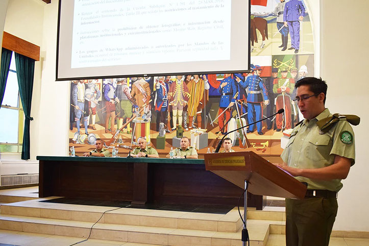 En su intervención el General Inspector Marcelo Araya señaló “nosotros debemos velar por la seguridad personal, por la seguridad de las operaciones, de las instalaciones y, sobre todo, de los instrumentos que están para el servicio policial, como son las redes sociales. El mensaje es velar por el debido respeto y resguardo a temas o asuntos del servicio. Todo tiene un efecto”.