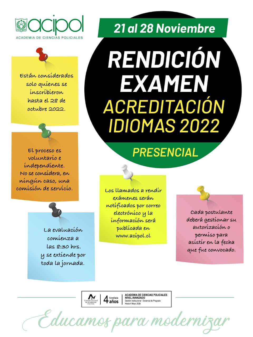 Con el fin de certificar el nivel de dominio de diferentes idiomas, la Academia de Ciencias Policiales continúa avanzando con el proceso de acreditación para todo el personal de Carabineros de Chile (PNS, PNI y CPRs) sin diferencias en cuanto a escalafón ni grados.